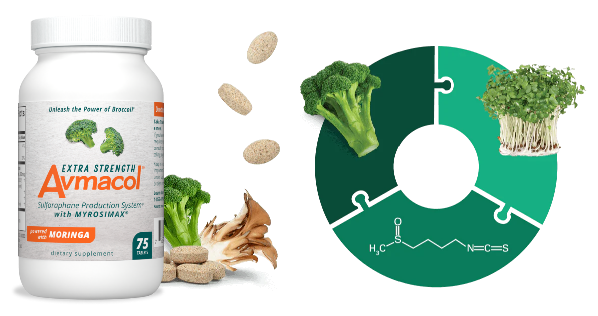 The Avmacol® brand contains both glucoraphanin and Myrosimax® (Active Myrosinase Enzyme), the essential ingredients needed to promote sulforaphane production.*Avmacol® products are supported with human research. Our exclusive Sulforaphane Production System® is validated in humans by measuring metabolites of sulforaphane collected in the urine.Because of the Sulforaphane Production System® exclusive to Avmacol®, the Avmacol® brand has been selected for use in more sulforaphane human clinical trials than any other supplement.1