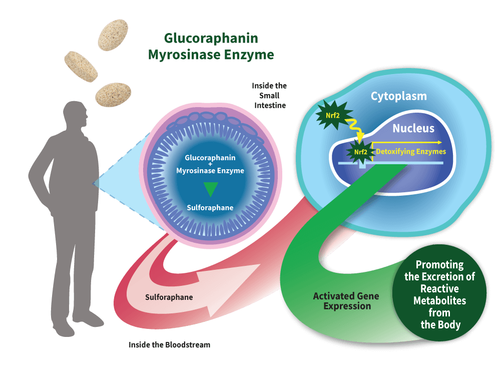 OurSulforaphane Production System®supplies broccoli seed extract (glucoraphanin) and Myrosimax® (Active Myrosinase Enzyme) which helps promote sulforaphane production in your body. As depicted in the diagram below, when sulforaphane enters your cells it allows for a master regulator, known as NRF2, to enter the nucleus and bind to DNA. This helps increase the production of important Phase 2 detoxifying enzymes, promoting your body’s natural detoxification process, thereby supporting the elimination of potentially harmful metabolites.*